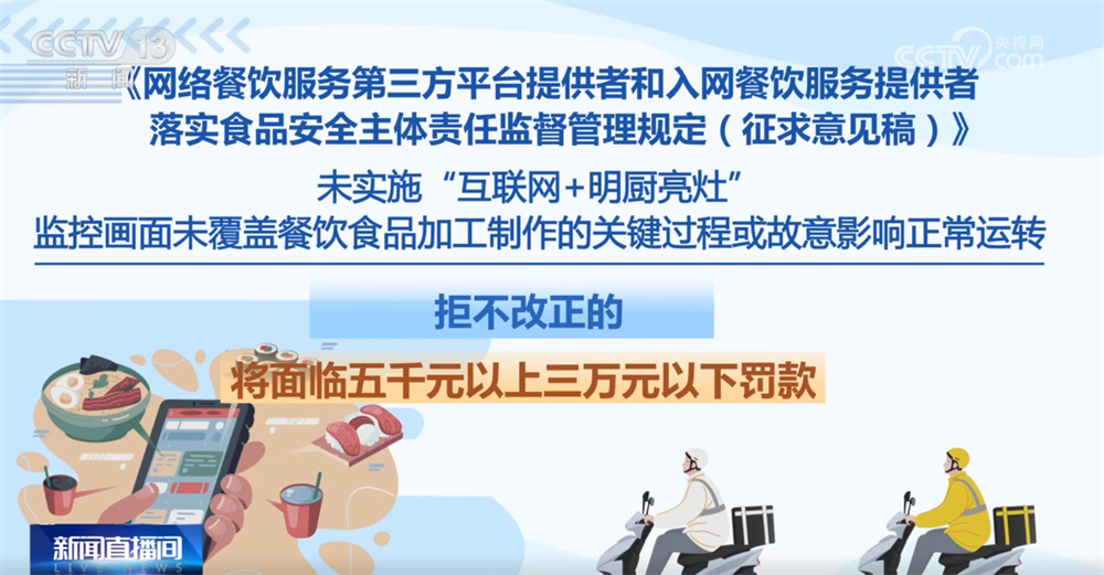 入网餐饮办事供给者该当实施“互联网+明厨亮灶”,画面笼盖餐饮食物加工制做的环节过程,并一般运转。同时,对餐饮食物进行包拆、封口,并封口后无法回复复兴和便于消费者辨识,防止餐饮食物正在配送过程中遭到污染。